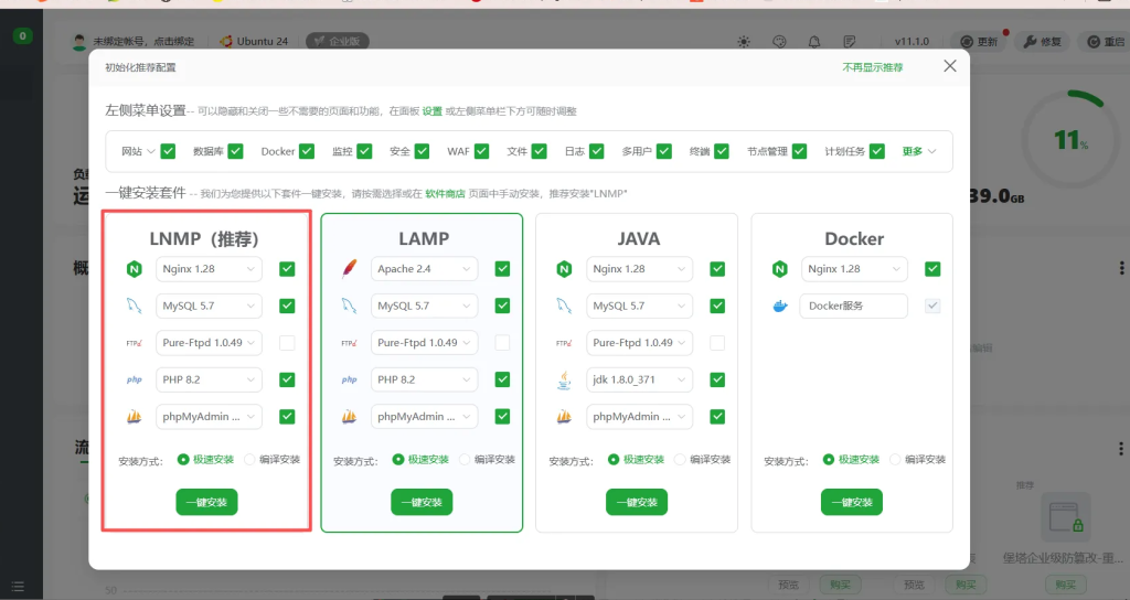 在宝塔面板中:选择推荐的LNMP或LAMP环境,建议版本(选择一键安装):