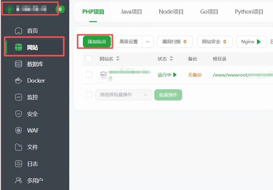 (1)点击左侧”网站” → “添加站点”