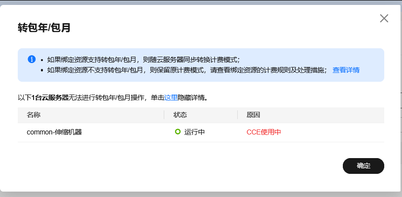 当ECS已绑定CCE(作为节点使用)时,无法直接转为包周期,需要进入cce操作。
